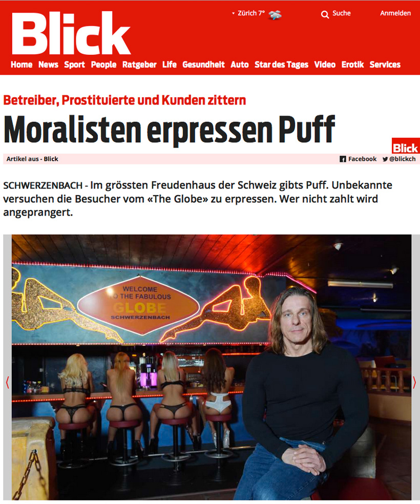 SCHWERZENBACH - Im grössten Freudenhaus der Schweiz gibts Puff. Unbekannte versuchen die Besucher vom «The Globe» zu erpressen. Wer nicht zahlt wird angeprangert.Im grössten Freudenhaus der Schweiz gibts Puff: Unbekannte erpressen die Besucher des Bordells The Globe in Schwerzenbach ZH. Sie erhalten an sie adressierte Briefe, versandt vom Postzentrum Zürich-Mülligen. Absender: Die Moralisten. «Wir sind Moralisten, und Du bist unser Ziel», steht am Anfang des Schreibens.