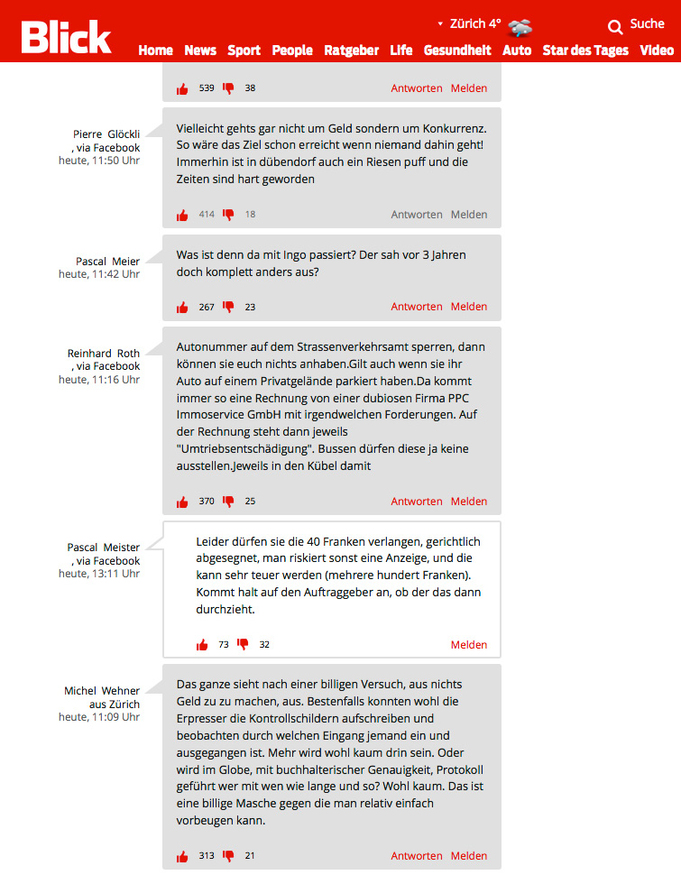 Tipps: 1. einfach abwarten, auf keinen Fall bezahlen. 2. In Gehdistanz hats einen riesigen PP vor einem Shoppingcenter. 3. Auskunftssperre für Autokennzeichen.