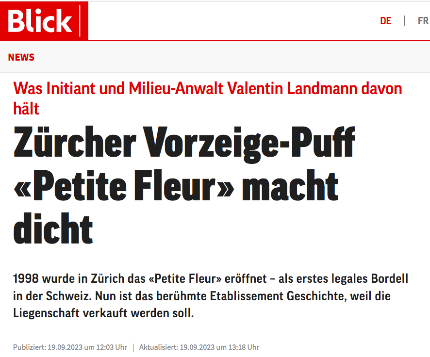 Am 25. Februar 1998 wurde in Zürich-Wollishofen das «Petite Fleur» eröffnet, nachdem der Zürcher Stadtrat grünes Licht für die Umbau- und Umnutzungsbewilligung gegeben hatte. Damit war das Rotlicht-Etablissement das erste legale Bordell der Schweiz – eine Sensation, die durch Milieuanwalt Valentin Landmann (73) medienwirksam begleitet wurde. Widerstand und Rekurse aus dem Quartier konnten die Eröffnung damals nicht verhindern.