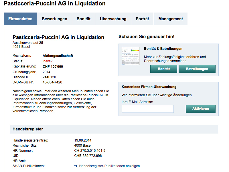ZitatAlles anzeigenDas Bistro Puccini in der Aeschenvorstadt hat offenbar bei Handwerkern und einem Lieferant Schulden. Der Inhaber hat bereits frühere Firmen in die Pleite geführt.