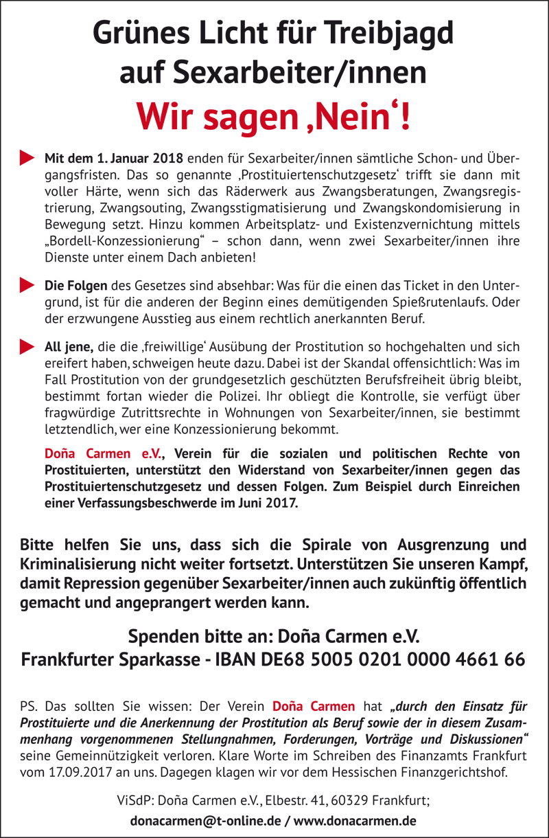 • Unterdessen wurde von einer Anwaltskanzelei im Namen von einigen Betreibern, Prostituirten und Freiern beim Bundesverfassungsgericht eine Verfassungsbeschwerde eingereicht, wobei auch die Kondompflicht beanstandet wird: