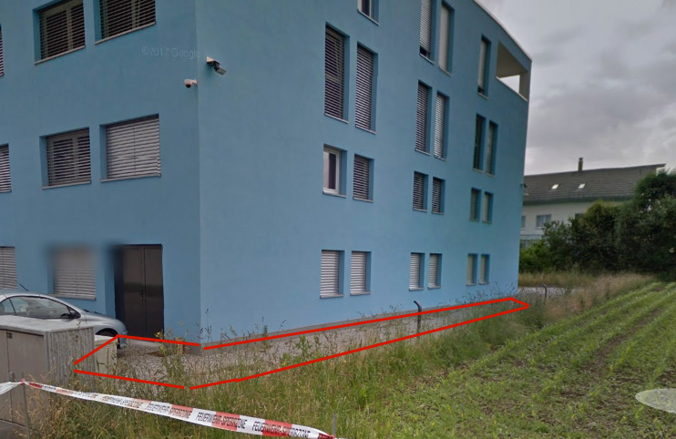 Auf dem Foto in rot eingezeichnet, sieht man wo die Terrasse nachträglich hingekommen ist, ein 3 Meter Breiter x 15 Meter Langer Schlauch seitlich am Gebäude entlang: