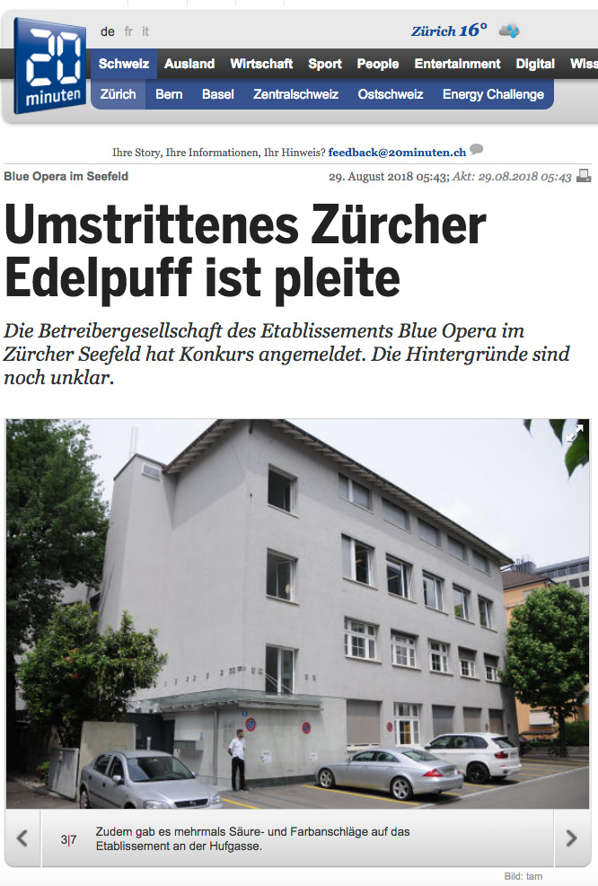 • Das Edelpuff Blue Opera im Zürcher Seefeld hat sein Angebot auf eine exklusive Kundschaft ausgerichtet. Reiche Männer sollten dort diskret Liebesdienste in Anspruch nehmen können. Dafür schien der Standort nahe dem Bahnhof Stadelhofen wie gemacht.