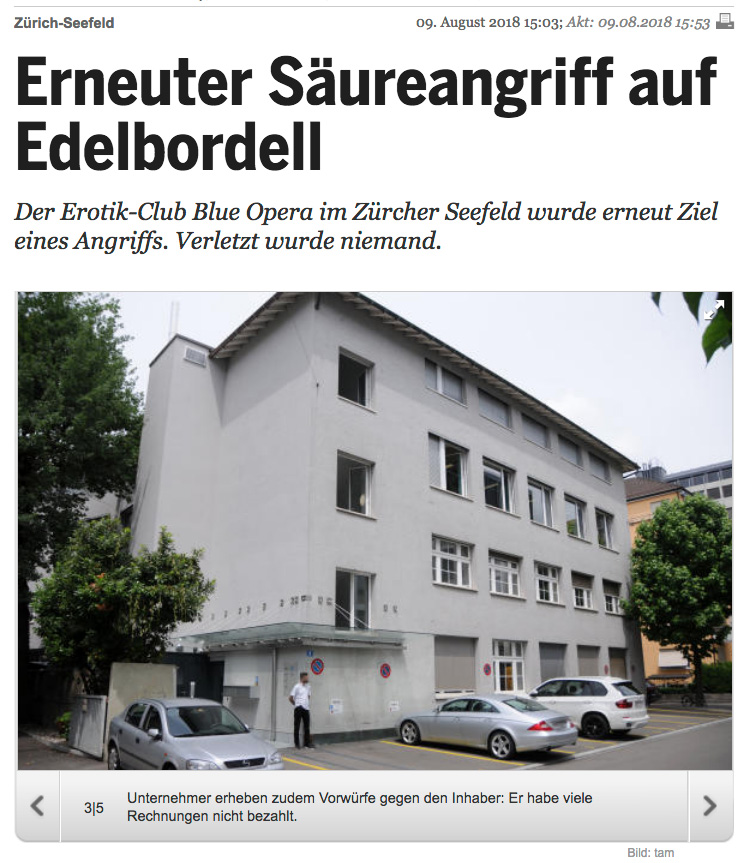 Die Angriffe mit Buttersäure und Farbe im Zürcher Seefeld kamen allerdings nicht ganz überraschend. Bereits Monate vor der Eröffnung verteilte ein Unbekannter in der Nachbarschaft ein anonymes Schreiben. In fehlerhaftem Deutsch gab sich der Verfasser als Nachbar eines weiteren Bordells aus, das der Besitzer des Blue Opera in Zürich führt. Als «besorgter Familien Vater» wolle er die Nachbarn vor dem warnen, was sie bei der Eröffnung des Clubs erwarten könnte, heisst es in dem Schreiben. Jeden Abend würden Zuhälter aus Rumänien, Ungarn und der Slowakei «die Mädchen» abholen. Die Nachbarn würden jeden Abend wegen Streitereien geweckt, und die Polizei würde jeden Monat eine Grossrazzia durchführen. Davon hat sich nichts bewahrheitet. Dafür aber ein weiterer Punkt: «Ca. alle 3 Monate Buttersäure anschlag (chemisches, hoch Stinkendes Gift)».