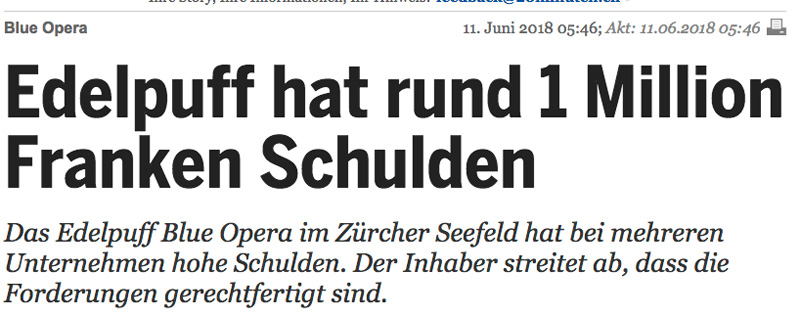 Der Bumsalp Eigner wie auch die Imperium Eigentümer waren schon lange vor Eröffnung deiner genannten Clubs Multi-Multi Millionäre.Der Unterschied zum Blue-Opera Betreiber Elwin ist, dass er nach aussen den grossen Macker gespielt hat (mehr Schein als Sein) und damit geprahlt hat, er habe früher in Ex-Jugoslawien mit Schmuggel Geschäften Millionen Schwarzgeld gemacht. Alles nur Bla-Bla, im Endeffekt eine Luftnummer. Auch seinem Peiniger, der ihm seinen Schädel zertrümmern und Buttersäure werfen lies, hat er nichts entgegenzusetzen und ist ihm schutzlos ausgeliefert. Auch das ist sehr naiv, einen Grossclub in Zürich City zu planen ohne sich vorher abzusichern. Das Blue-Opera war von Beginn an, als reines Spekulations-Projekt geplant. Es war vom Betreiber nie vorgesehen, dass Blue-Opera zu eröffnen, denn es wurde schon lange vor der Eröffnung nach einem meistbietenden Käufer im zweistelligen Millionenbereich gesucht. Da sich kein Käufer für den Mietvertrag inkl. Bewilligung für einen zweistelligen Fantasie Millionenbetrag finden lies, musste er den Club wohl oder übel eröffnen und nach einem Käufer weitersuchen, das beweist auch die Low-Budget und Konzeptlosigkeit (zuerst Saunaclub, zwei Tage später Studio, dann wieder Saunaclub, egal...) denn es war nie sein Plan den Club zu eröffnen, sondern einen Dummen zu finden und sich mit den Millionen zur Ruhe setzen. Bei diesem hochspekulativen Spiel darf man nicht vergessen, dass er Handwerker, Personal, Vermieter und viele andere Gläubiger geprellt hat die nun auf ihren Forderungen sitzen bleiben. Insofern hat er mit fremden Geld und Existenzen gezockt und deshalb kann man durchaus von Täuschung oder Betrug sprechen.