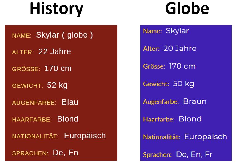 Es gibt bei ihr Unterschiede zwischen Globe und History (angefügtes Bild); für einen Ausweis nicht konform, für die meisten von uns eher nebensächlich wären die 2Jahre; 2kg und Augenveränderungen; doch das Schlimmste am Schluss ihres Steckbriefs: kein Fransösich an der EU-Aussengrenze zur Grande Nation