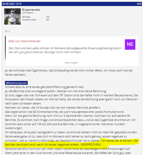 Im 6profi-Forum – einem bekannten Schweizer Sexforum mit Fokus auf Club- und Szeneberichte – werden in diesem Unterforum Erfahrungsberichte, Diskussionen, Meinungen, Aktionen, Events sowie Einzelthemen rund um den Saunaclub Lavie Herdern gesammelt und dokumentiert.