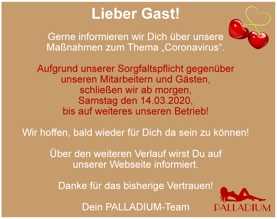 ich war heute in einen Club , . der Club hat einen Arzt geholt um die Mädchen zu checken wegen dem Virus als vorsichtsmassnahme. Wir haben lange mit dem Arzt an der Rezeption gesprochen. Er hat gesagt kein Panik nötig aber der Club muss aufpassen und keine fehler machen: auf der Homepage sofort den Service von den Frauen runternehmen soll, der club darf nicht mehr schreiben mit ZK, FO und andere Sachen und den Frauen vorschreiben was die für einen Service machen sollen sonst kann der Club ganz leicht geschlossen werden und noch haftbar gmacht werden mit Finanziell für den Einsatz und gesundheitliche Schaeden bei Frauen!!!! Auch Desinfektionsmittel am Rezeption und Bad bereitstellen damit der Club zeigt das er für die Gesundheit was macht auch wenn es nicht viel hilft sagte er.