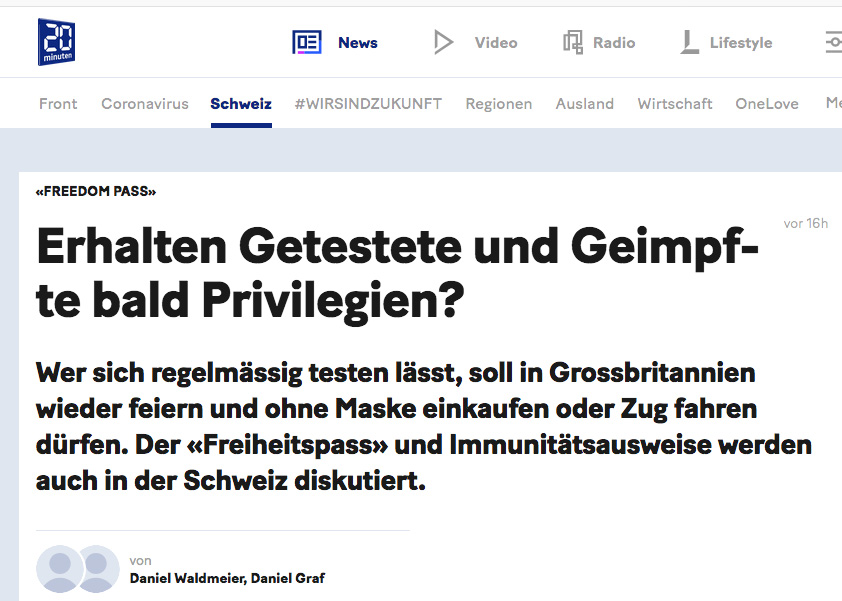 Bleibt nur noch anzufügen, leider auch eine Wiederholung diverser User: es gibt Fälle, wo Verschwörungstheorien (VT) sich später als Verschwörungpraxis! entpuppen. Zum mal bei einem unserer Hauptakteure zu bleiben: Wie kann ein Bundesrat drei Handies löschen lassen, und warum nur er? Ich hätte auch viele Ideen wessen ganze Festplatte zu säubern, aber es liegt zum Glück nicht an mir. Wollen wir es Boris Johnson überlassen? Eine Big Brother-würdige von "Freedom Pass" für geimpfte, Impfzwang durch die Hintertür? Titelstory im "20 Minuten" heute, kein Mucks über Kreuzimmunität.*