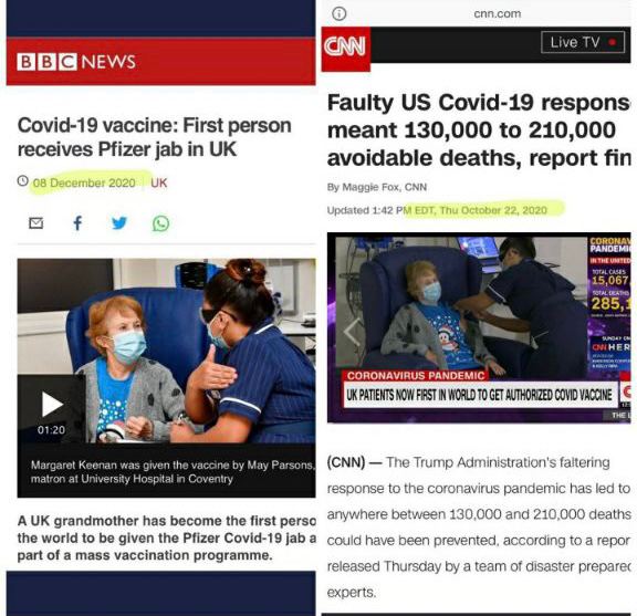 Der BBC-Artikel befasst sich mit der "ersten geimpften Oma". Und der CNN-Artikel befasst sich mit der "zögerlichen Reaktion der Trump-Regierung auf die Pandemie, welche zwischen 130.000 und 210.000 unnötigen Todesfällen verschuldet habe sowie der ausweichenden Positionierung der Administration zu diesem Vorwurf". Welchen journalistischen "Mehrwert" hätte in diesem Zusammenhang das Bild der "Impfung einer Oma in Großbritannien" ...? Richtig: KEINEN.