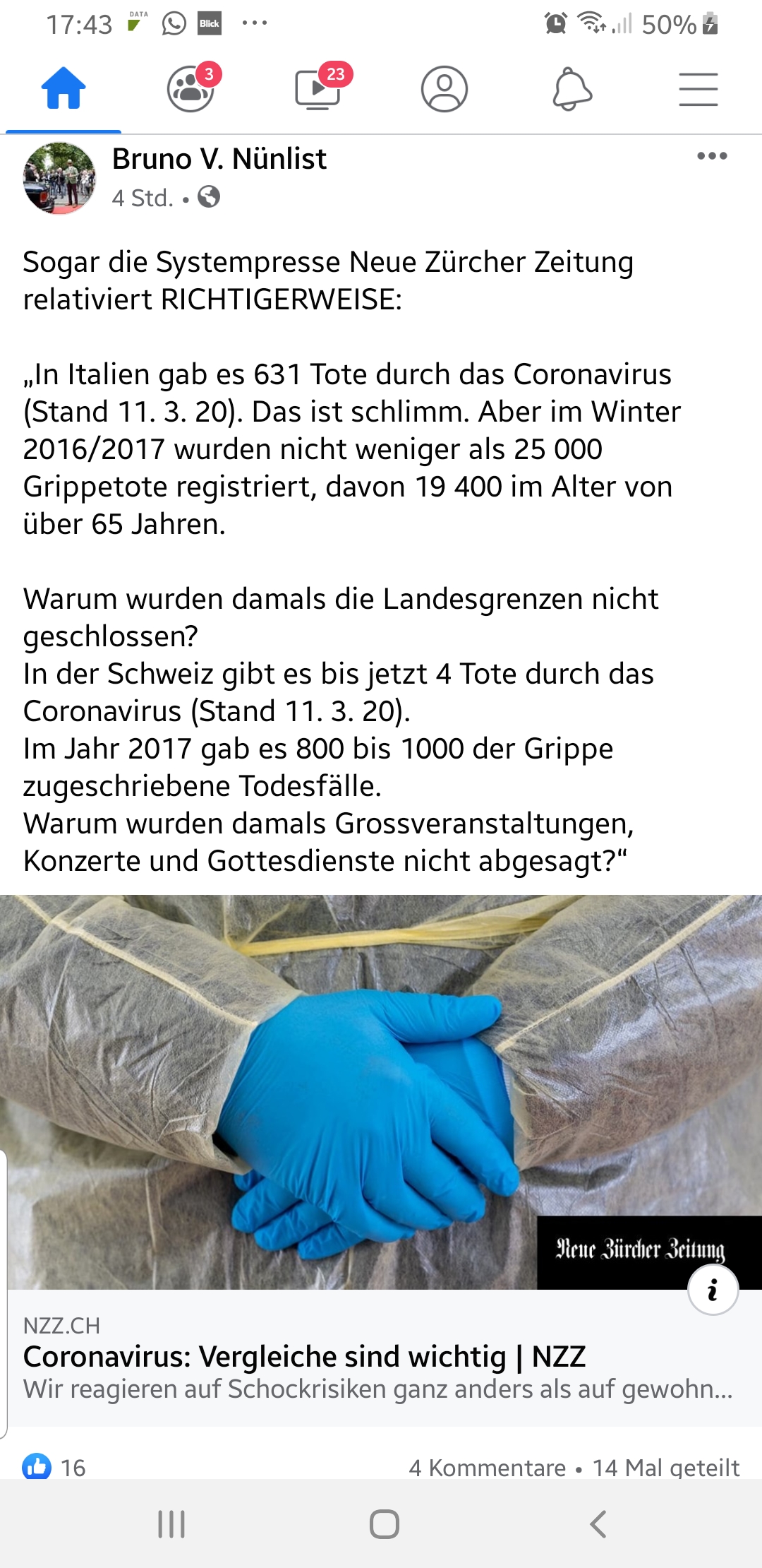 • Würde man die Maskenpflicht einführen, müsste man ja eingestehen, dass man das Volk seit Wochen belügt, da nimmt man doch lieber ein paar Kranke oder Tote mehr in Kauf. Natürlich, würden Masken schützen, sicher nicht zu 100% aber sollten es auch nur 50% sein, müssen wir diese doch nutzen. Die Aussage, es sollten nur Kranke welche tragen ist doch lächerlich, denn viele Menschen wissen nicht einmal dass sie den Virus haben, also würde es doch Sinn machen, wenn alle eine Tragen. Da halte ich es mit den deutschen, die haben die ganze Kommunikation viel besser im Griff als unser super Bundesrat, klare Ansagen und Hinweise in Deutschland, keine Strategie und grässliche Kommunikation in der Schweiz.