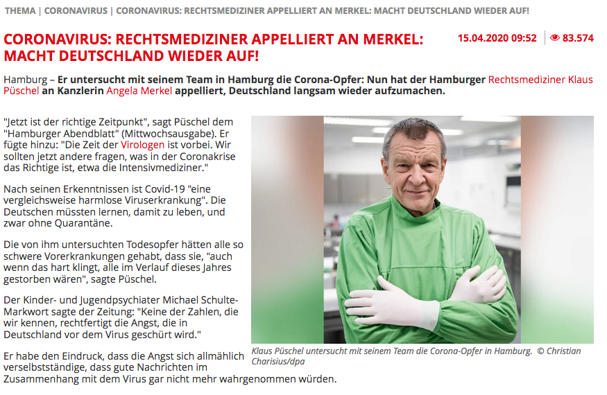 Nach allem, was man bisher über Covid-19 weiss, ist es so, dass das Virus für Menschen mit schweren Vorschädigungen gefährlich sein kann. Der Leitende Forensiker der Freien und Hansestadt Hamburg, die auch ein Bundesland ist, hat die in seinem Zuständigkeitsbereich an Covid-19 Verstorbenen obduzieren lassen. Nach seiner Aussage wiesen alle Toten besagte Vorerkrankungen auf und das Virus leistete einen mehr oder minder grossen Beitrag zu ihrem Dahinscheiden; Quellen hier oder hier. Die Menschen sind mit dem Virus im Körper gestorben aber auch an ihm?