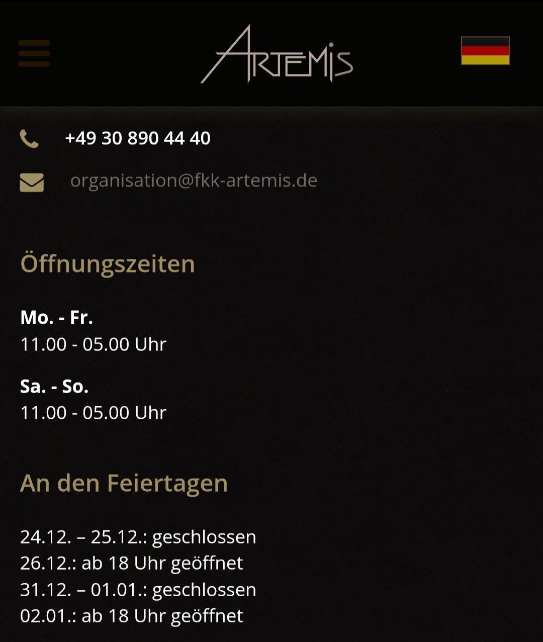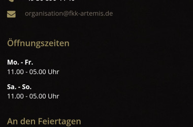 Ich war am 04.01.2026 im Artemis und zwar von ca. 18.00 Uhr bis 02.30 Uhr. Die Zeit im Club verflog wie im Flug. Ja, die hatten zu, die Öffnungszeiten hatte ich vorher auf der Website gecheckt. Anbei ein Screenshot der Website steht unten bei Feiertagen.