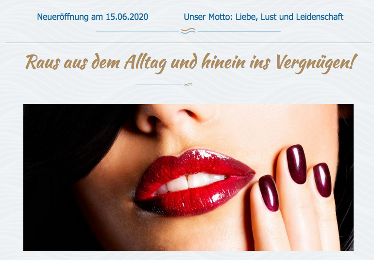Bald ist es soweit und die Eroktikbetriebe dürfen ihren Betrieb wieder aufnehmen.Auch wir freuen uns am 15.Juni eröffnen zu dürfen.Wie das so ist bei Neueröffnungen schleichen sich Fehler ein, die nun nach und nach behoben werden.Die Homepage wird bearbeitet und auch die Schreibfehler werden korrigiert.