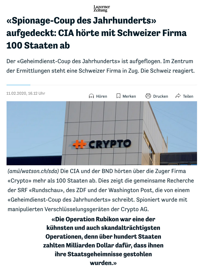 Die CIA und deutschen Geheimdienst mit manipulierter in der Schweiz hergestellten Software spitzeln lassen und dafür Milliarden kassieren, Vertrauenswürdigkeit und Datenschutz in der neutralen Schweiz
