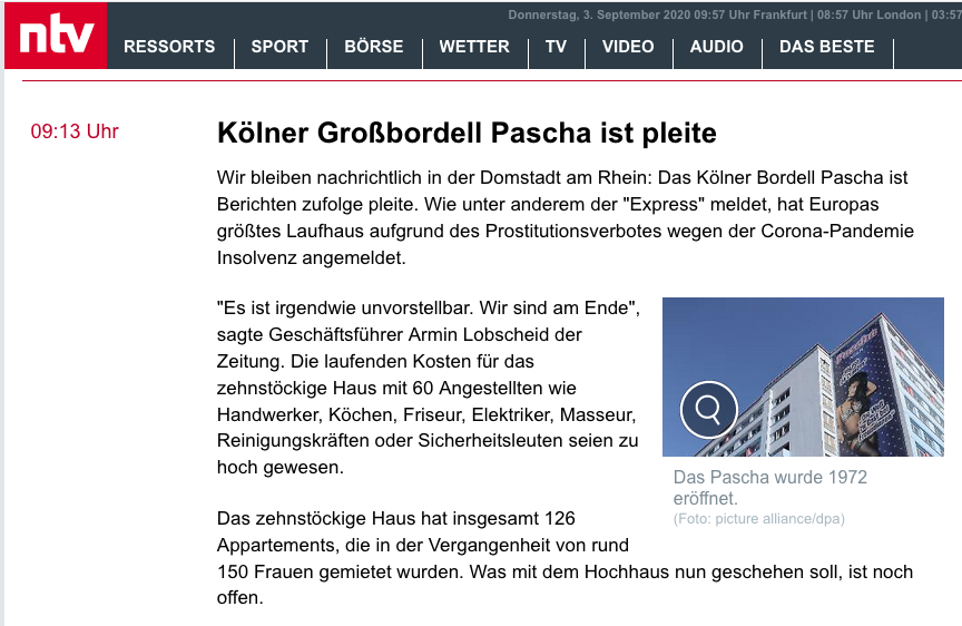 Ich bin anderer Meinung und meine, es war ausichtlos. Ich unterstelle, keiner lässt mir-nix- dir nix seinen Betrieb bankrott gehen, entlässt aus Jux und Dollerei seine Mitarbeiter, und macht sich nen fröhlichenund ruhigen Lenz als Wohlstandsrentner. Keiner lässt grundlos seine Existenz absichlich fallen. Pascha war ein gemietetes Laufhaus mit 10 Etagen , 100 Appartements ( hoher Personalaufwand ), in besten Zeiten 100 Frauen und hohen Fixkosten. Dennoch hat allein der lock-down das Pascha in den Konkurs getrieben. Und es wird nicht der einzige Club bleiben, der auf der Strecke bleibt.