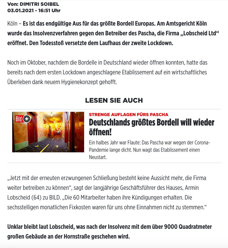 Ich bin anderer Meinung und meine, es war ausichtlos. Ich unterstelle, keiner lässt mir-nix- dir nix seinen Betrieb bankrott gehen, entlässt aus Jux und Dollerei seine Mitarbeiter, und macht sich nen fröhlichenund ruhigen Lenz als Wohlstandsrentner. Keiner lässt grundlos seine Existenz absichlich fallen. Pascha war ein gemietetes Laufhaus mit 10 Etagen , 100 Appartements ( hoher Personalaufwand ), in besten Zeiten 100 Frauen und hohen Fixkosten. Dennoch hat allein der lock-down das Pascha in den Konkurs getrieben. Und es wird nicht der einzige Club bleiben, der auf der Strecke bleibt.