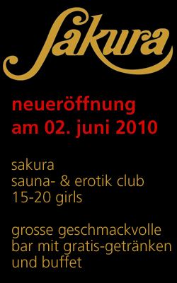 ZitatDas Pussyclub Sakura bleibt ab dem 31. Jan bis wir alle Whirpools - eine Bar (unten) neue Sanitäre Anlagen , und Lichtshows installiert haben bis auf weiteres geschlossen . Weiter kommt hinzu , Showprogramme / Einlagen - neue Zimmer mit TV / Video - Intime Kuschel Ecke . etc. etc.Bis dahin würden wir gerne euch liebe Paare und Einzelpersonen - gerne wie bis anhin - empfangen.In diesem Sinne bedanken wir uns , bei unseren treuen - zufriedenen und allen anderen Gästen !Bis auf ein wohlgestärktes Wiedersehen ! im Neuen Jahr / Look !