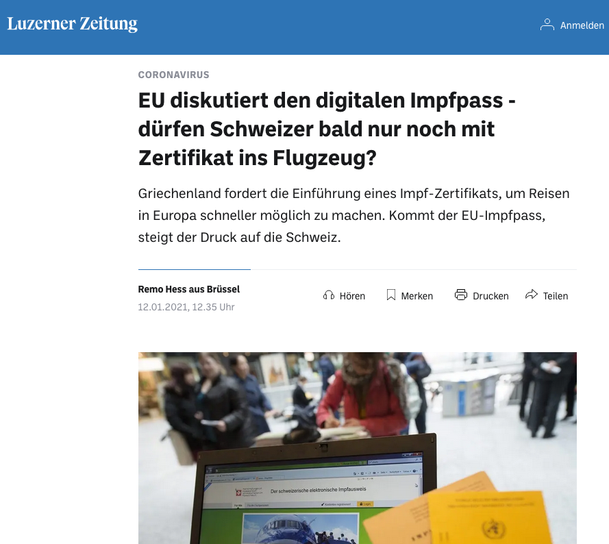 6profi hat heute von einem Mitglied des Nationalrat erfahren, dass auch die Schweiz auf Druck der EU an einem Digitalen Impfpass arbeitet, der bis zum Sommer diesen Jahres in der Schweiz eingeführt werden soll. Bürger sollen sich dann für Besuche von Gastronomie, Clubs, Bordelle, Tourismus, körperbezogene Dienstleistungen usw. "frei-impfen" lassen können (indirekter Impfzwang) soll auch für das Personal dieser Branchen gelten. Also ohne regelmässige Impfungen gesellschaftlich isoliert zuhause bleiben und Arbeitsverbot für ungeimpftes Personal, ganz nach chinesischem Vorbild "Schöne neue Welt", das SRF hat bereits berichtet.