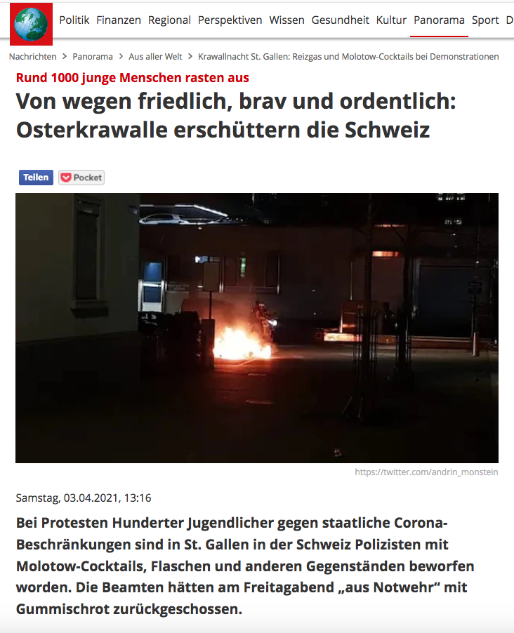 Bei Protesten Hunderter Jugendlicher gegen staatliche Corona-Beschränkungen sind in St. Gallen in der Schweiz Polizisten mit Molotow-Cocktails, Flaschen und anderen Gegenständen beworfen worden. Die Beamten hätten am Freitagabend „aus Notwehr“ mit Gummischrot zurückgeschossen.