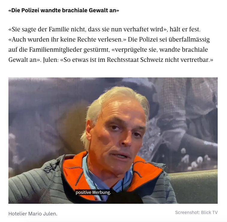 der blick gibt den relativ unglaubwürdigen subjektiven augenzeugenbericht eines einzelnen wider. „ohne vorwarnung“ ist offensichtlich unzutreffend, nach x verwarnungen und sogar einem betonblock vor dem eingang! und wieso sollte die polizei auch mit schuhen(!) auf jemanden losgehen? ausserdem steht keines der worte „brutal“, „brutalst“ oder „verprügelt“ im bericht, hingegen heisst es, die familie habe sich zunächst nicht gewehrt, was impliziert, dass sie sich schliesslich eben doch gewehrt hat. fazit: die behörden haben es lange mit gut zureden versucht und dabei eine engelsgeduld bewiesen - wäre der walliser wirt ein ausländer gewesen, würde die svp von kuscheljustiz schreiben! aber irgendwann muss der rechtsstaat halt durchgesetzt werden. der vergleich mit nazimethoden und gestapo etc. ist schlicht unglaublich.