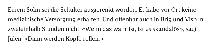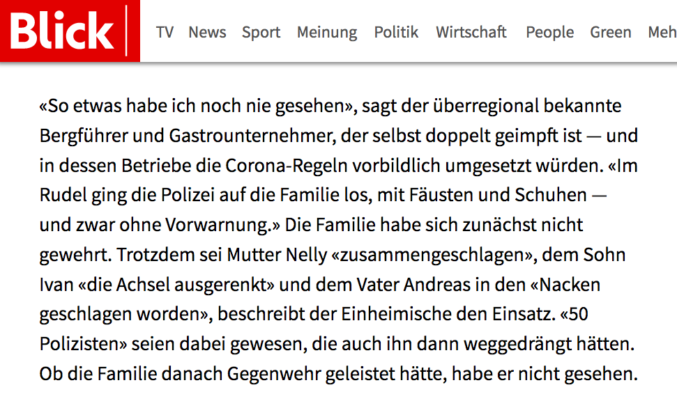 der blick gibt den relativ unglaubwürdigen subjektiven augenzeugenbericht eines einzelnen wider. „ohne vorwarnung“ ist offensichtlich unzutreffend, nach x verwarnungen und sogar einem betonblock vor dem eingang! und wieso sollte die polizei auch mit schuhen(!) auf jemanden losgehen? ausserdem steht keines der worte „brutal“, „brutalst“ oder „verprügelt“ im bericht, hingegen heisst es, die familie habe sich zunächst nicht gewehrt, was impliziert, dass sie sich schliesslich eben doch gewehrt hat. fazit: die behörden haben es lange mit gut zureden versucht und dabei eine engelsgeduld bewiesen - wäre der walliser wirt ein ausländer gewesen, würde die svp von kuscheljustiz schreiben! aber irgendwann muss der rechtsstaat halt durchgesetzt werden. der vergleich mit nazimethoden und gestapo etc. ist schlicht unglaublich.