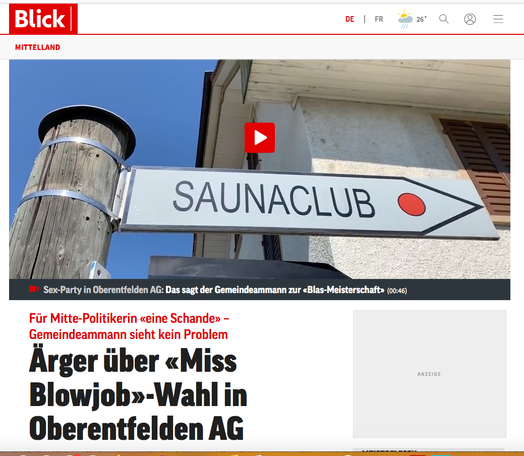 Auf dem Werbeplakat des Sauna-Clubs Sex-Park in Oberentfelden AG steht in grossen Buchstaben geschrieben, was am 21. Mai 2022 ab 15 Uhr stattfinden wird: Die «Blas-Meisterschaft», der «grösste Blowjob-Contest der Schweiz». Auf dem Flyer werden potenzielle Gäste direkt angesprochen: «Teste unsere 8 Top-Bläserinnen völlig gratis!» Danach könne man seine Bewertung abgeben und damit die «Miss Blowjob 2022» wählen.