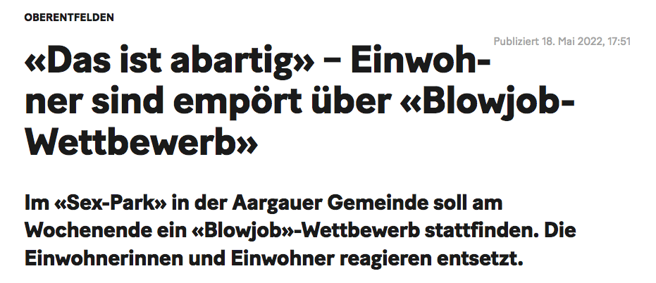 Auf dem Werbeplakat des Sauna-Clubs Sex-Park in Oberentfelden AG steht in grossen Buchstaben geschrieben, was am 21. Mai 2022 ab 15 Uhr stattfinden wird: Die «Blas-Meisterschaft», der «grösste Blowjob-Contest der Schweiz». Auf dem Flyer werden potenzielle Gäste direkt angesprochen: «Teste unsere 8 Top-Bläserinnen völlig gratis!» Danach könne man seine Bewertung abgeben und damit die «Miss Blowjob 2022» wählen.