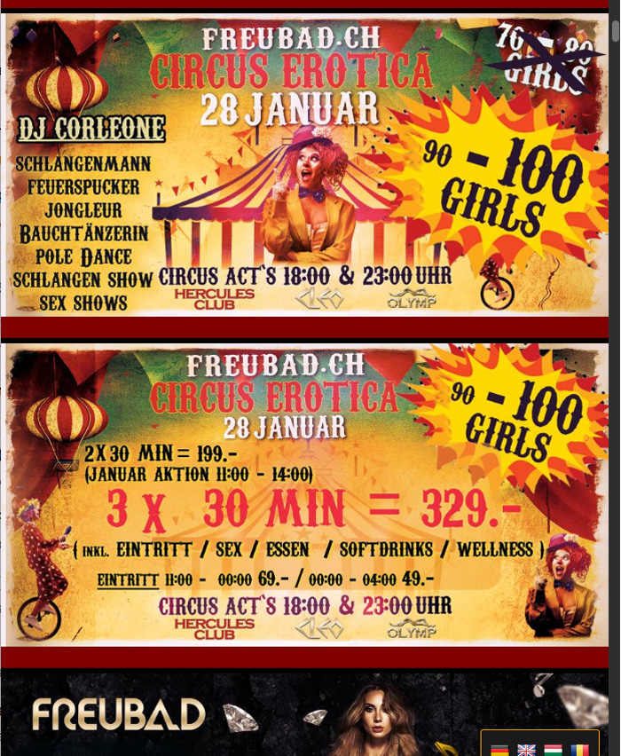 Der circus erotica auftakt. Es wird noch dieses Jahr neuer Standard im freubad sein , mit 100 Frauen wochends Party! Pfeiffern die Spatzen von den Dächer. Neue Massstäbbe für die Club szenerie in der Schweiz!!!@ 320.00 fr. Pauschal, Eintritt, 3x 30min. Vollservice, Essen, Getränke.