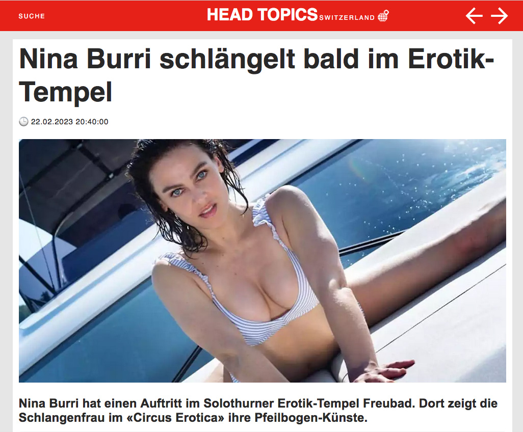Nina Burri hat einen Auftritt im Solothurner Erotik-Tempel Freubad. Dort zeigt die Schlangenfrau im «Circus Erotica» ihre Pfeilbogen-Künste.