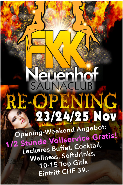nun ist es 22.15 Uhr und wir haben seit über 10 Stunden den Club FKK-Neuenhof erfolgreich neu eröffnet. Wir sind bisher äussert zufrieden und seitens der Gäste haben wir nur positive Rückmeldungen erhalten.