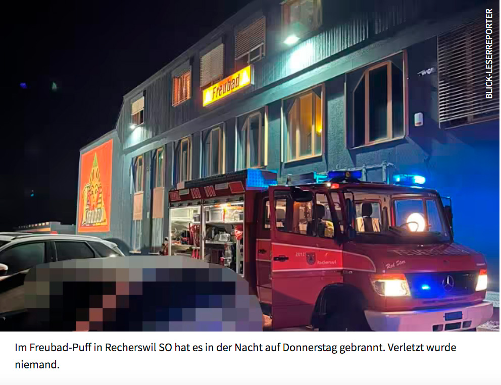 Puff im Puff! Wie ein Blick-Leserreporter berichtet, hat es im Bordell Freubad in Recherswil SO in der Nacht auf Donnerstag gebrannt.