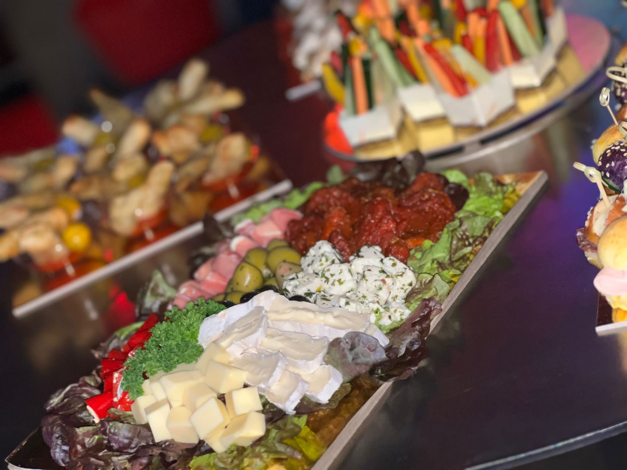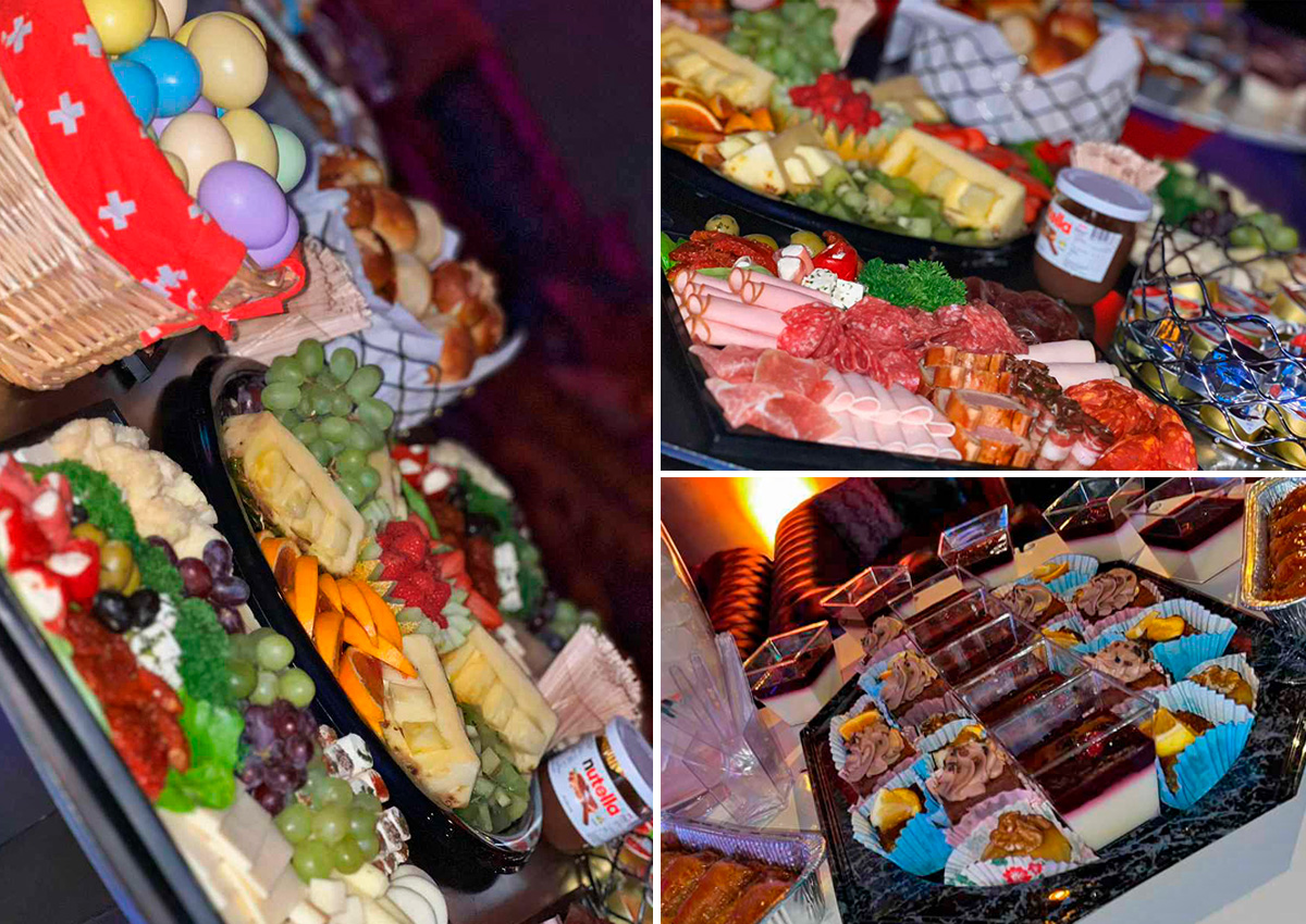 Zwischen Bar, Bühne, Sofas und Kücheneingang standen zwei Tische mit dem Buffet. Kalte Platten, Brot und Beilagen waren übersichtlich, aber hochwertig angerichtet. Käse, Aufschnitt, Speck, Salami und Bündnerfleisch in einer ausgewogenen Auswahl.