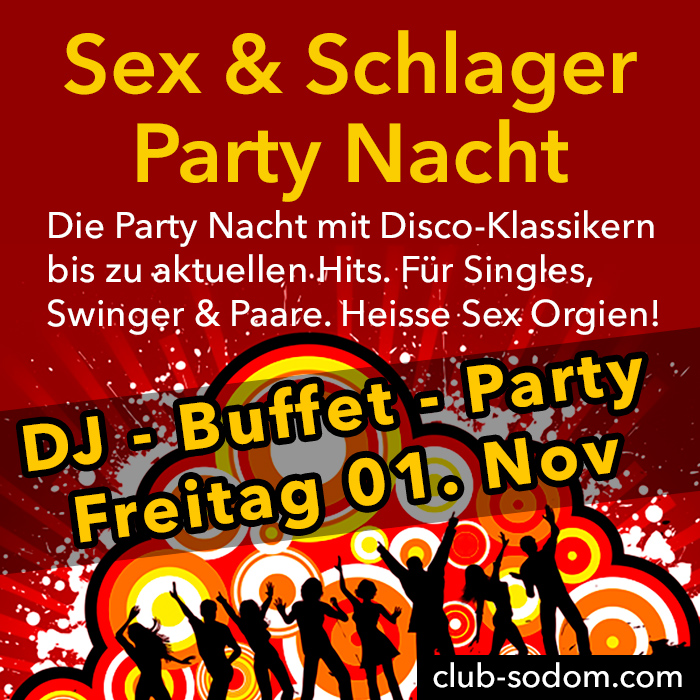 Die Schlager-Party Nacht für Singles, Swinger, Paare am Freitag 01.11.2024 von 19.00 bis 03.00 Uhr im Club Sodom. Der perfekte Mix aus heisser Party, Tanzen, guter Unterhaltung, Buffet und leidenschaftlichen Sex Erlebnissen. Sei dabei, lass Dich von der Magie des Abends mitreissen und erlebe die Lust hautnah.
