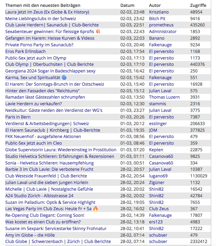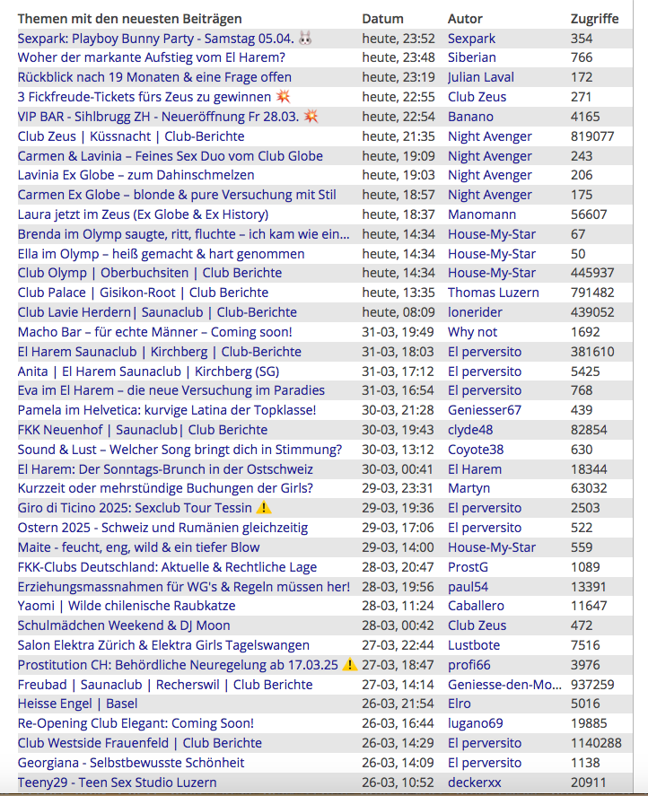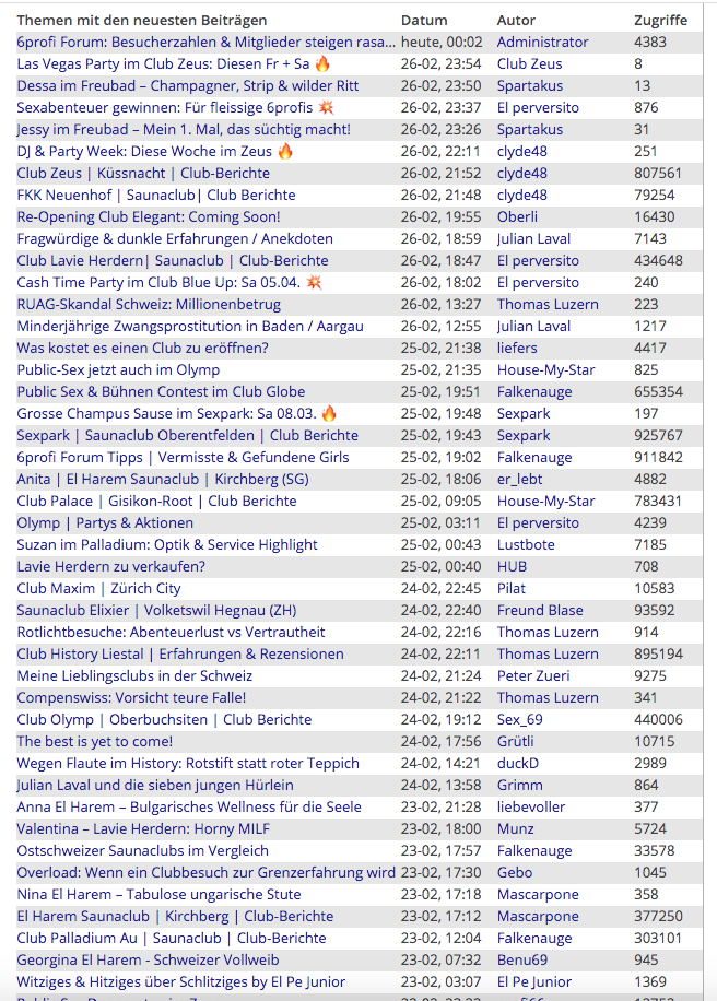 Schon seit über 17 Jahren gibt es das 6profi-Forum – es hat sich als das offizielle Sexforum der Schweiz etabliert und wächst stetig weiter! In Kürze dürfen wir neue, spannende Partner-Clubs begrüßen, und es sind verschiedene Aktionen für unsere engagierten Autoren in Planung. Unsere Community zählt mittlerweile über 50.300 Mitglieder, und das Forum verzeichnet durchschnittlich 12.000 Besucher pro Tag.