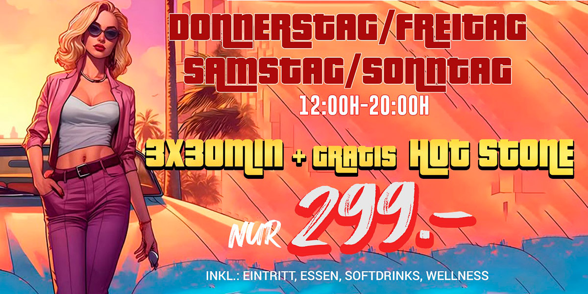 - Eintritt, 3x Halbe Stunde Vollservice, Buffet, Softdrinks, Wellnessanlage: nur 299.- Fr