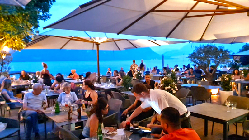 Für unsere Gruppe waren Tische direkt am Wasser reserviert, mit Blick auf den Anleger der Ausflugsschiffe und das Bergpanorama im Abendlicht. Urlaubsfeeling pur! Die Speisekarte ließ keine Wünsche offen: ob Antipasti, Pizza, Pasta, Salate, Fleisch oder Fisch. Das Essen überzeugte auf ganzer Linie, ebenso der Service: aufmerksam, freundlich, schnell.