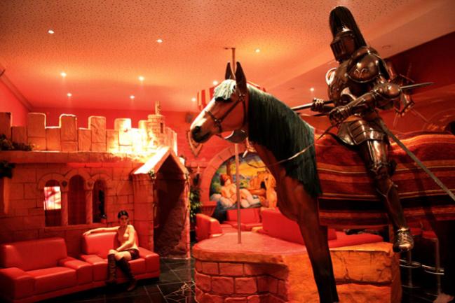 Vergiss nicht das Badetuch gekonnt umzuwickeln. Dann gehst Du durch die andere Tür raus und denn rechts in den Korridor und die nächste Türe wieder rechts. So kommst Du in die Bar/Kontaktraum, welche von diesem grässlichen Ritter Lancelot auf seinem Ross dominiert wird. Tja ist halt Geschmacksache. Rechts ist das kleine Kino und daneben noch ein kleines Separée mit zwei Couches. Alles in ritterlichem Ambiente. Hinter der Bar sind übrigens die Toiletten. Du wirst hier wohl auch die ersten Schönheiten antreffen. Aber zuerst schnappst Du Dir ein Glas, damit Du dann so obercool den Club erkunden kannst.