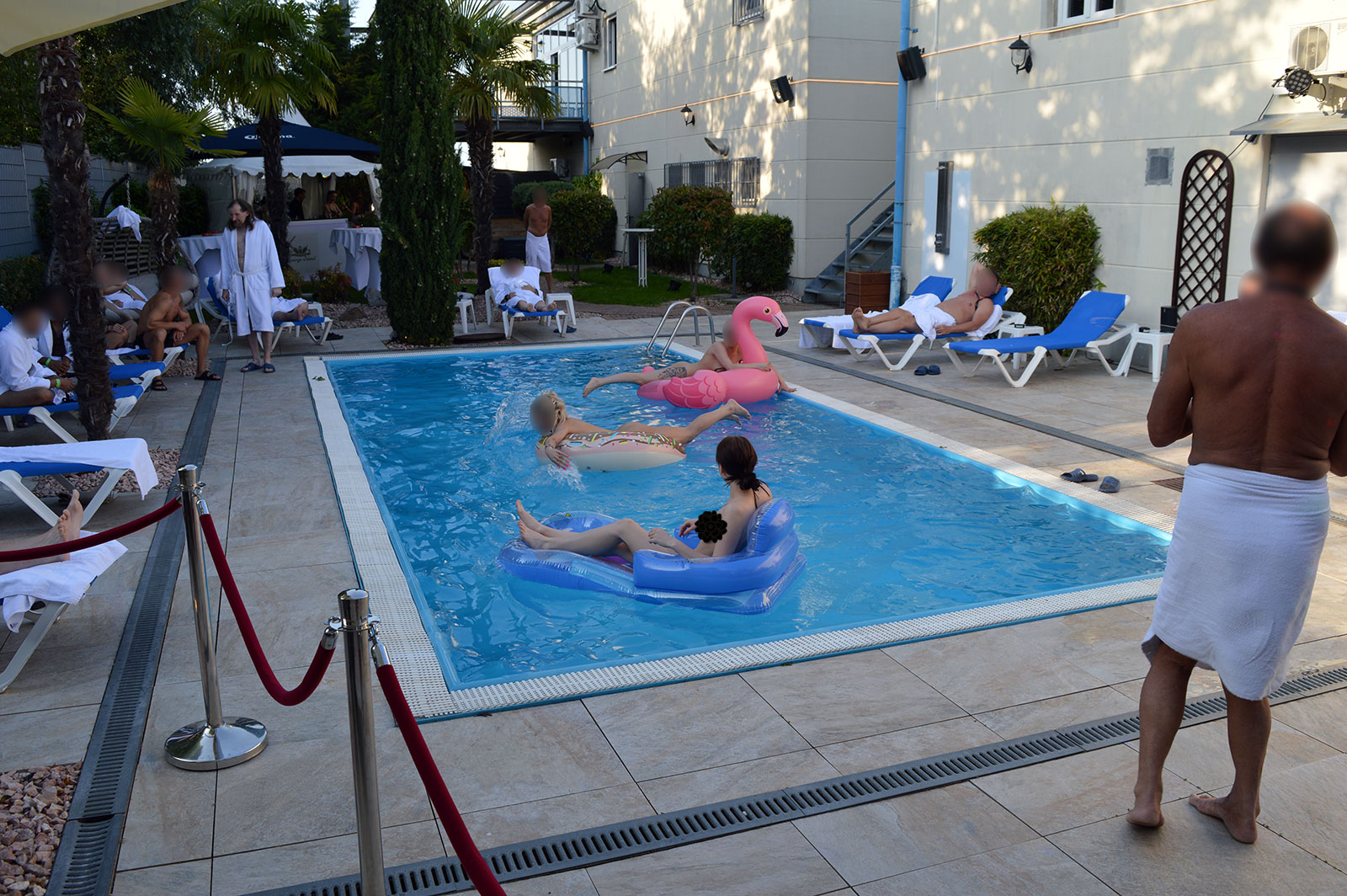 In der grosszügigen Umkleide geduscht und dann rein in den Hauptraum. Schaut zwar mit den rosa getünchten Wänden (Flamingo eben) ein wenig billig aus. Aber alles da: Bar, Swimmingpool, drei Saunen, vier Whirlpools zum selber Füllen. Eine Treppe geht's hoch zu einer weiteren kleinen Bar, wo die Mädels an den Spielautomaten ihr sauer verdientes Geld wieder verprassen dürfen. Pornokino und Fitnessraum sind auch noch da. Wieder die Treppe runter, geht es noch ein paar Stufen runter zum Restaurant. Dann hinten raus an der Grillhütte vorbei zum Aussenpool. Dann ein paar Liegen und ein Whirlpool. Fickhütten und Aussensauna. Schönes und angenehmes Freiglände, muss ich sagen. Und auch sonst recht grosser Club und alles da, was es braucht.