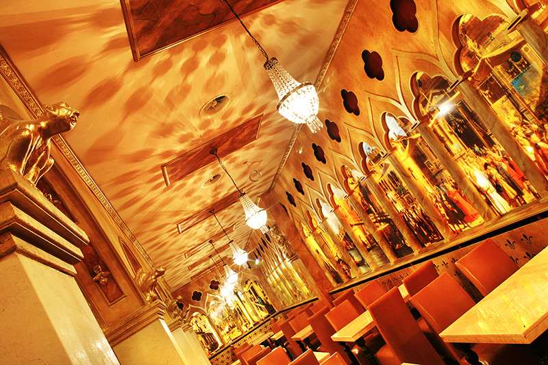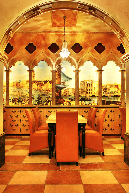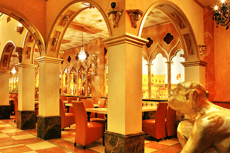 Aufgebaut ist es wie eine Basilika, dreischiffig sozusagen, das Mittelschiff ist leer, in den beiden Seitenschiffen sind Tische mit bequemen Lederstühlen, im „Altarraum“ befindet sich die Buffet-Theke, an dem man sein Menü bestellen kann, also keine Selbstbedienung. Das Intérieur ist stilistisch dem Dogenpalast in Venedig nachempfunden, mit Ausblick auf gemalte Stadtszenen aus der Renaissancezeit und Deckengemälden von Michelangelo, toll, sowas in der Art habe ich zuletzt im sensationellen Hotel Venetian in Las Vegas gesehen.
