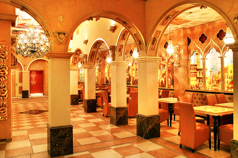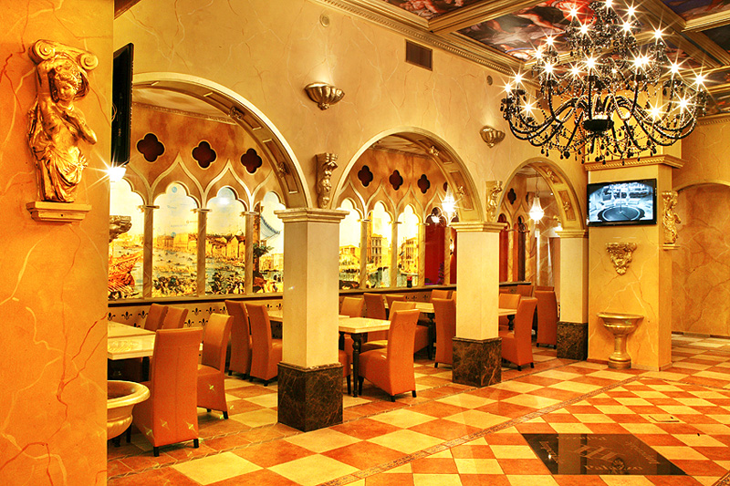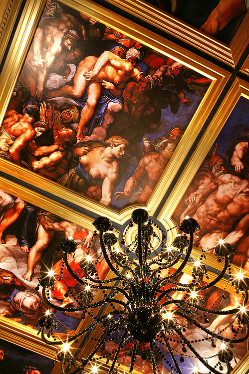 Aufgebaut ist es wie eine Basilika, dreischiffig sozusagen, das Mittelschiff ist leer, in den beiden Seitenschiffen sind Tische mit bequemen Lederstühlen, im „Altarraum“ befindet sich die Buffet-Theke, an dem man sein Menü bestellen kann, also keine Selbstbedienung. Das Intérieur ist stilistisch dem Dogenpalast in Venedig nachempfunden, mit Ausblick auf gemalte Stadtszenen aus der Renaissancezeit und Deckengemälden von Michelangelo, toll, sowas in der Art habe ich zuletzt im sensationellen Hotel Venetian in Las Vegas gesehen.