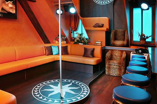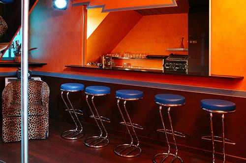 Den Korridor entlang geht es eine enge Wendeltreppe eine Etage höher. An der kleinen Sauna und an einem weiteren Dusche/WC vorbei und dann links und gerade wieder rechts in die winzige Bar. Auf der einen Seite drei Hocker auf den andere drei Seiten Sitzgelegenheiten. In der Mitte eine Tanzstange. Alles in Griffweite.
