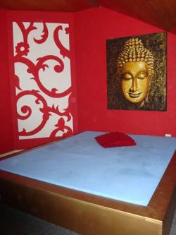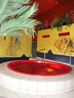 Wenn Du aus der Dusche nach rechts gehst findest Du den Whirlpool. Knöpfe rechts an der Wand. Um den Whirlpool herumlaufen, durch die mit Vorhang behängte Türöffnung und Du befindest Dich in der Videoecke. Direkt links gibt es ein halboffenes Zimmer mit 2 Betten, dazu im Videoraum noch eine Sauna und ein Dampfbad welche als Zimmer umgestaltet wurden.