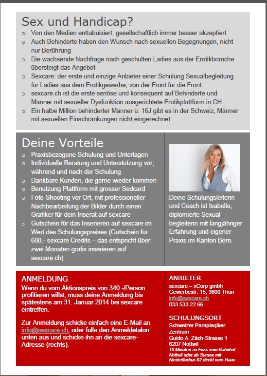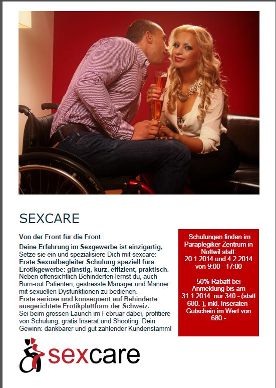 Der Beamer projiziert eine Internetseite auf die Wand, eine Brunette mit kurzem Rock ist zu sehen, daneben steht «Fabienne» geschrieben, «Cup-Size D» und «Intimrasur: glatt rasiert». In den nächsten Tagen werden die Frauen selber ein solches Profil anlegen. Auf der Seite Sexcare.ch sollen Männer mit einer Behinderung eine Sexarbeiterin finden, die mit ihrem Handicap umgehen kann, sei es eine Demenz, eine Querschnittlähmung oder eine Erektionsstörung (siehe Kasten). Sexcare.ch ist seit Dienstag online. Ein vergleichbares Angebot gibt es in der Schweiz bisher nicht.