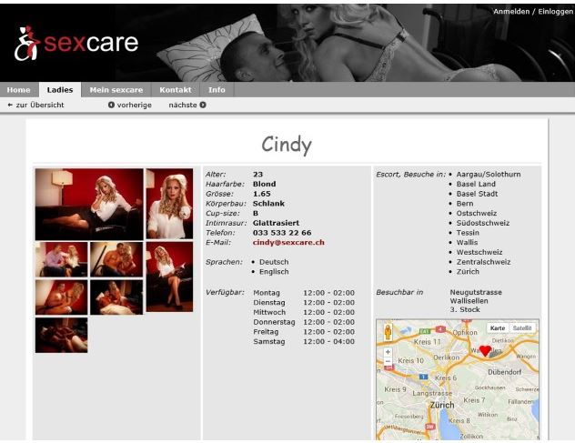 Auf der Seite Sexcare.ch können Prostituierte inserieren. Sie geben an, auf welche Behinderungen sie eingehen können, zum Beispiel ob ihr Studio rollstuhlgängig ist oder ob sie Männer mit Demenz bedienen.