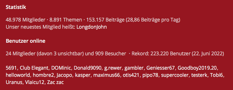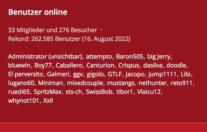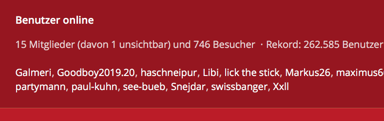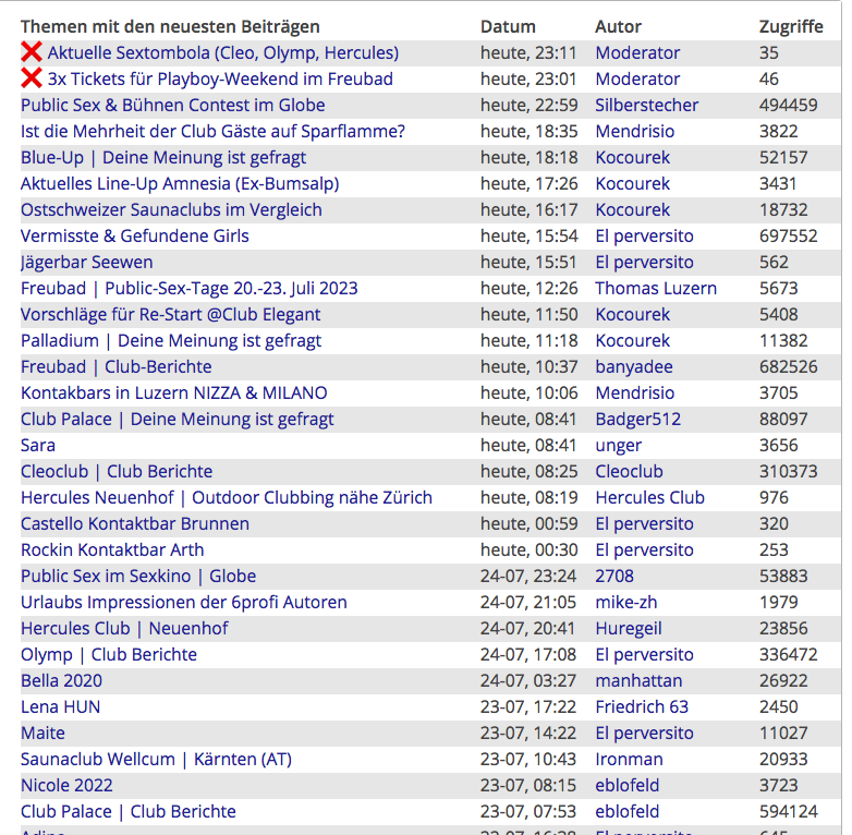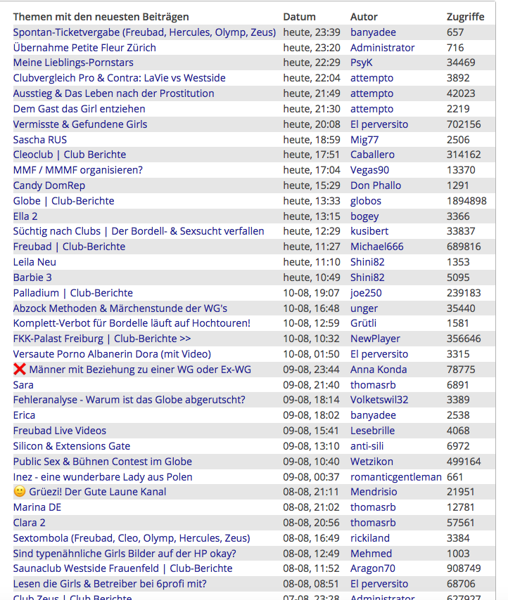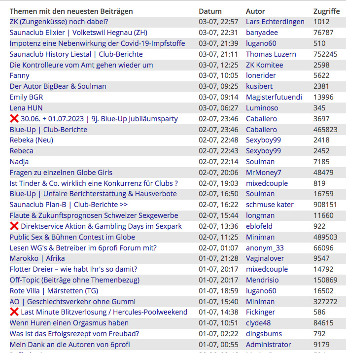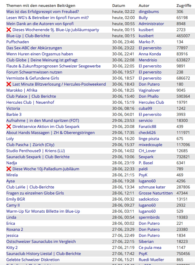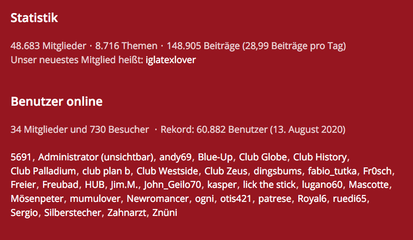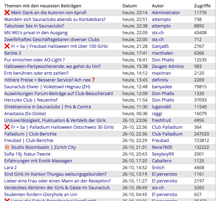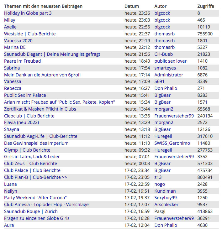 Wie Ihr der nachstehenden Statistik entnehmen könnt, sind jetzt in diesem Moment gerade 966 Besucher und 19 Mitglieder im Forum zeitgleich anwesend. So kommen täglich viele Tausende Besucher im Forum zusammen. Effektiv sind im Forum knapp 50.000 Mitglieder registriert. Das will was heissen! Deshalb ist 6profi das offizielle und führende Sexforum für die Schweiz - mit den besten Clubs & Girls.