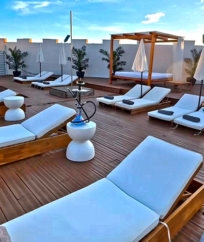 Der Außenbereich ist wunderschön und hochwertig neu gestaltet worden. Besonders die Bar mit ihren feinen Drinks hat den perfekten Standort. Ich fühle mich dort wie in einer entspannten Diskothek, sitze auf dem Barhocker, beobachte die Szene und schlürfe einen Drink nach dem anderen. Dabei kommen immer wieder Girls vorbei, um Nachschub an Getränken zu ordern.