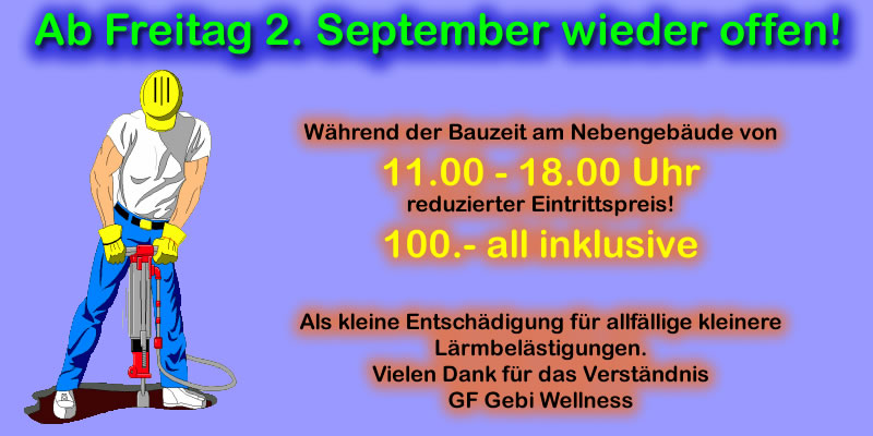 Hab gerade auf der Homepage http://www.gebi-wellness.ch gelesen dass ab 2.Sept. wieder offen sein soll. Dann war der Schaden wahrscheinlich nicht so riesig.