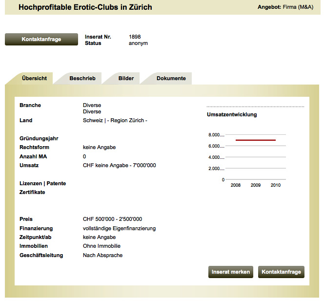 HOCHPROFITABLE EROTIC-CLUBS in Zürich und Zentralschweiz zu verkaufen".