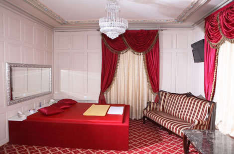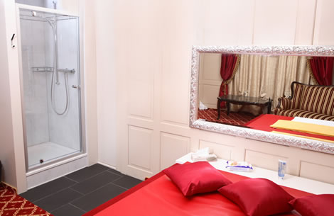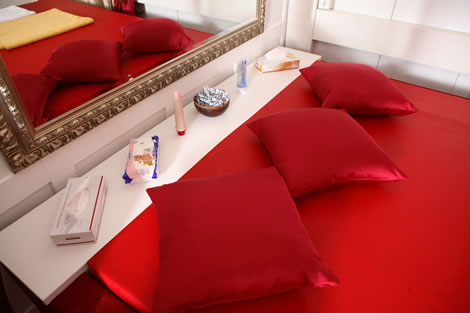 Nach wenigen Augenblicken erschien dann auch schon die schöne Grace. Wirklich die reinste „Erscheinung“, dieses Mädchen! Nachdem wir einander bekannt gemacht hatten und sie mir dabei verraten hatte, dass sie aus Rumänien kommt, entführte sie mich in ein in tiefem Rot gehaltenes Zimmer im ersten Stock, ausgestattet mit einem großen Bett, einem großen Spiegel an dessen Kopfende, einer blitzblank sauberen Duschkabine und einem großen Flatscreen an der Wand. Worauf ich liebend gerne verzichtet hätte, war der Pornofilm, der ungebeten über den Flatscreen flimmerte. Ich habe ihn einfach so gut wie möglich übersehen und überhört. Denn ich wollte mich auf Grace und auf sonst nichts konzentrieren. Das Zimmer an sich und seine Einrichtung fanden aber durchaus mein Gefallen.